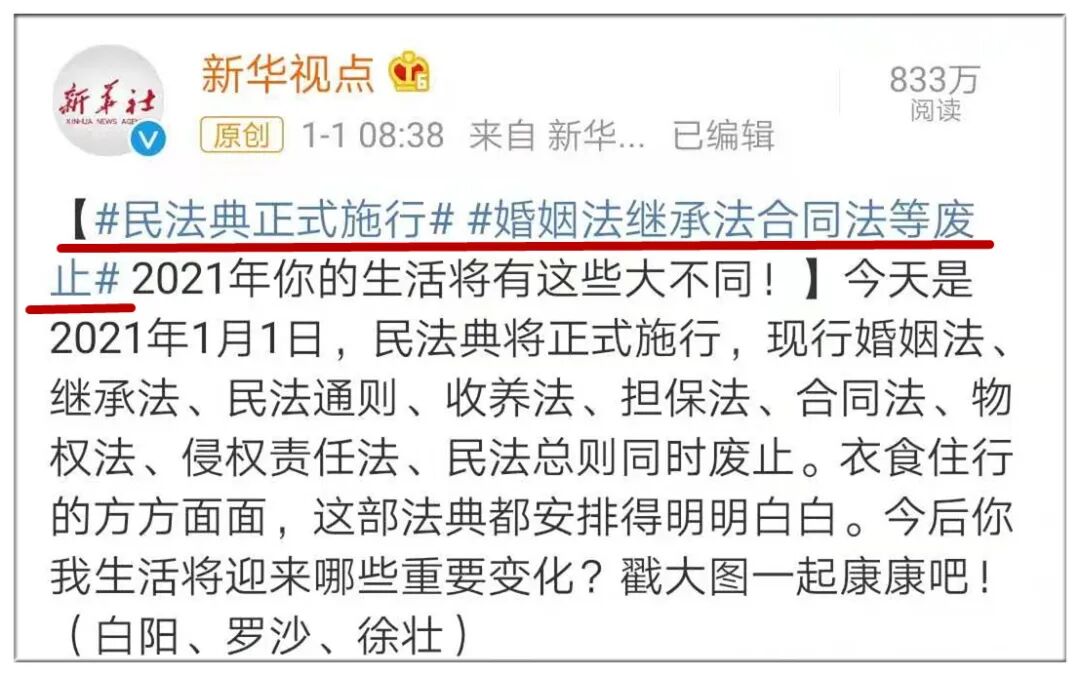 2021年1月1号开始执行的民法典,立即火爆全网,仅热搜榜就占了4条,民法典为啥能引起了这么大的关注?原因就是它和我们的生活关联太密切了,把衣食住行、生老病死、婚丧嫁娶和遗产继承这些与老百姓生活息息相关的日常纳入了法治的轨道。